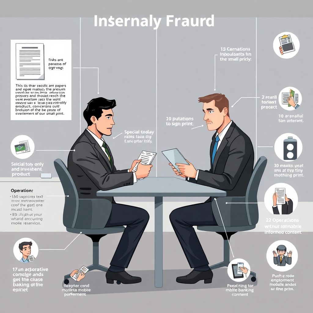 Более опасный сценарий — операции, фактически проводимые без осознанного согласия клиента: подключение платных СМС‑пакетов, изменение статуса счёта, открытие дополнительных вкладов с менее выгодной ставкой, списание скрытых комиссий за «сервисное сопровождение». В цифровой среде риск возрастает, когда сотрудник в офисе помогает установить мобильное приложение и под этим предлогом получает доступ к коду из СМС или пуш‑уведомлению. Формально клиент сам подтверждает операции, но фактический контроль в этот момент у сотрудника. Юристы квалифицируют такие случаи как превышение доверия и нарушение процедуры аутентификации, а при наличии ущерба — как состав для гражданского и иногда уголовного разбирательства, если доказано намерение обогатиться за счёт клиента.